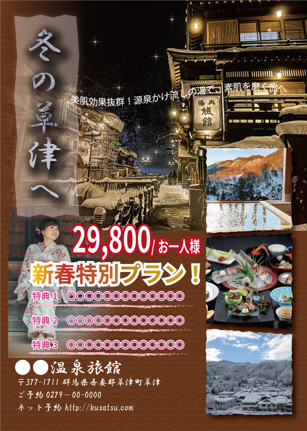 温泉旅館をテーマにチラシを作成。「冬の温泉地」を意識して作成しました。